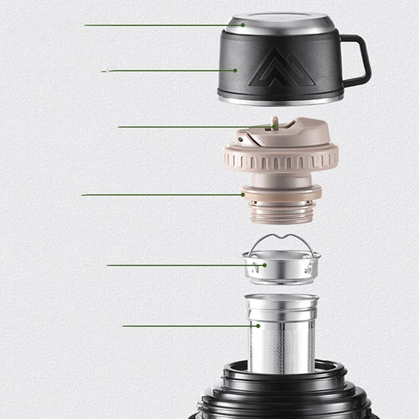 Cerek perjalanan bertebat vakum, diperbuat daripada 316 keluli tahan karat dan keluli tahan karat 201, dengan pelapik dalaman yang diperbuat daripada 316 keluli tahan karat gred tinggi, yang anti-pengoksidaan dan tidak mempunyai bau walaupun selepas penyimpanan air jangka panjang.